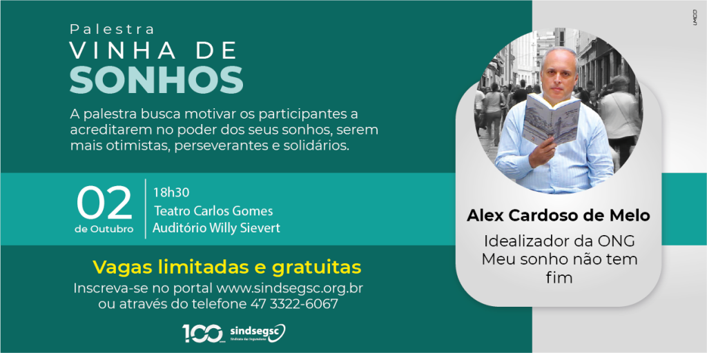 Evelyn Guarnieri O Teatro Carlos Gomes, em Blumenau, receberá a palestra “Vinha de Sonhos”, principal projeto da ONG “Meu Sonho Não Tem Fim”, idealizada por Alex Cardoso de Melo. A iniciativa integra o calendário de eventos comemorativos aos 100 anos do Sindicato das Seguradoras de Santa Catarina (SindsegSC) e promete ser uma jornada reflexiva e […]