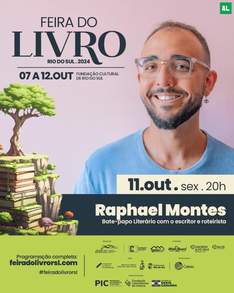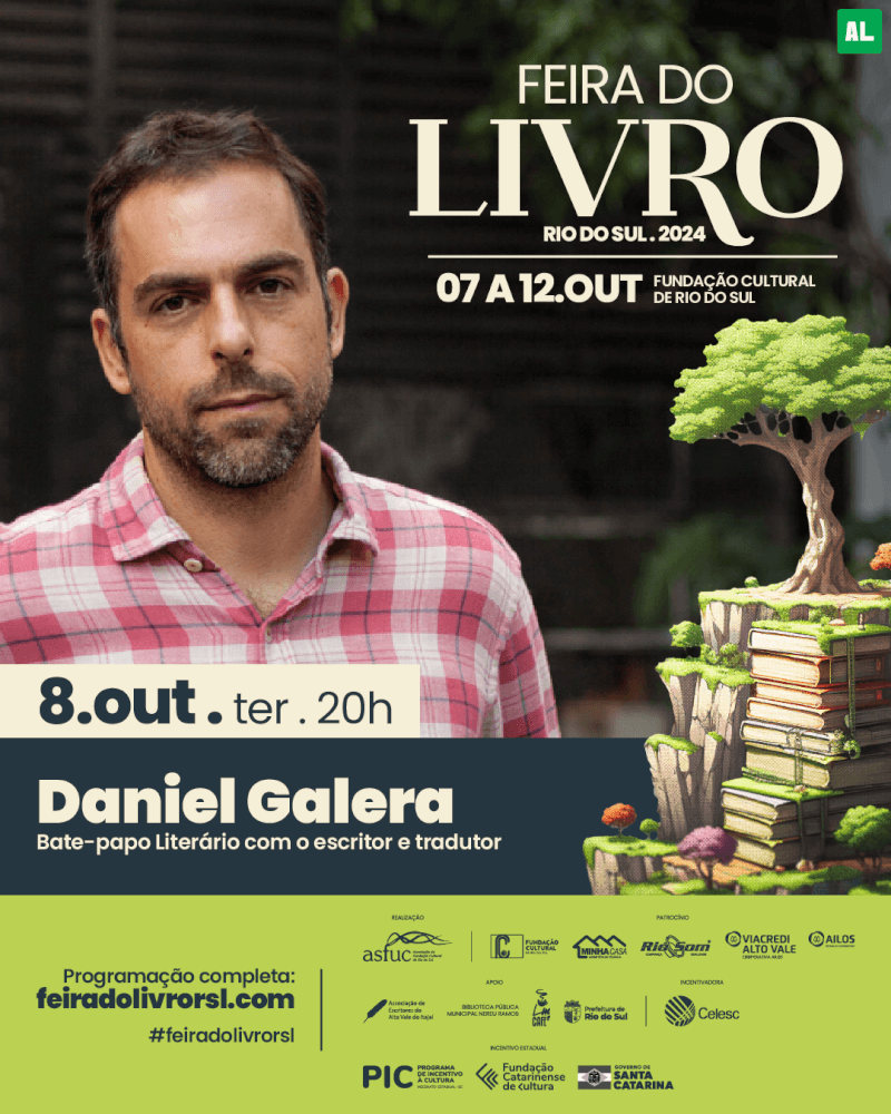 A Feira do Livro de Rio do Sul terá autores premiados nacionalmente na literatura e com trabalhos na área do cinema. Um deles é o escritor e tradutor Daniel Galera, autor de vários romances, entre eles Barba ensopada de sangue, que este ano deu origem a um filme. Já o escritor e roteirista Raphael Montes é autor do romance policial Bom Dia, Verônica, que além do sucesso de crítica e de vendas virou série na Netflix.