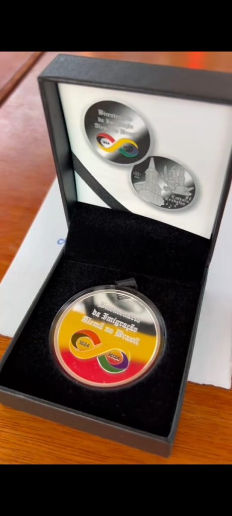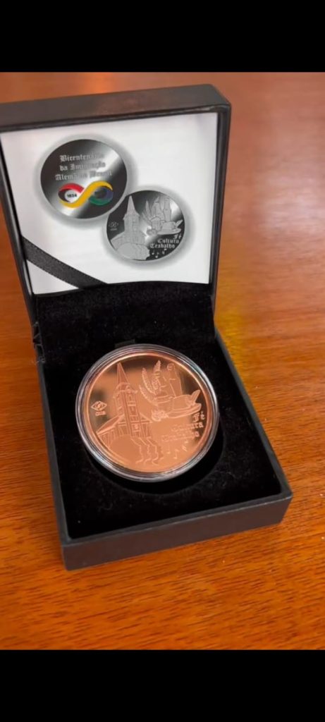 Confeccionada pela Casa da Moeda, a medalha foi cuidadosamente idealizada para representar a cultura e o legado desses imigrantes, como forma de homenagear a história de luta e coragem dos povos germânicos que escolheram o Brasil como seu novo lar.